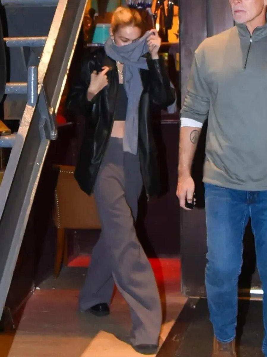 DiCaprio sported black pants, a big black coat, white sneakers, a baseball cap, and a mask that covered most of his face. Hadid covered her face with a blue scarf while sporting a midriff top, a leather jacket, and other outfits.
