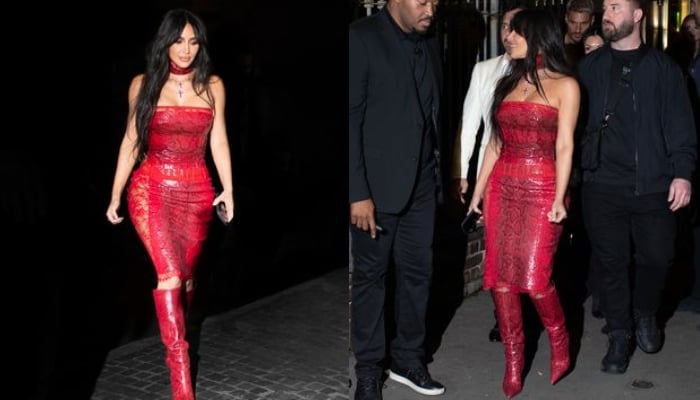 In the photographs, Kim stunned in the red Dolce & Gabbana look that consisted of a strapless red snakeskin dress featuring sheer lace panels completed with matching knee-high boots and a choker around her neck.