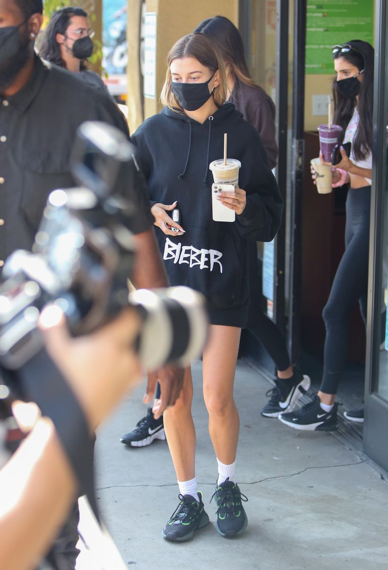 Whereas Hailey wore an oversized black hoodie from Justin Bieber’s tour, the hoodie had ‘Bieber’ printed on it and she paired it with skin-tight shorts.